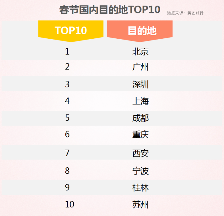 從境內(nèi)游目的地排行榜可以看到,一線城市仍是最具人氣的目的地。北京、廣州、深圳、上海、成都位列前五,重慶、西安、寧波、桂林和蘇州緊隨其后。其中,桂林是不少選擇旅游過(guò)春節(jié)的消費(fèi)者的首選,另外還有南方目的地收獲了眾多想要春節(jié)出游的消費(fèi)者的關(guān)注,包括惠州、揭陽(yáng)、清遠(yuǎn)、珠海等。