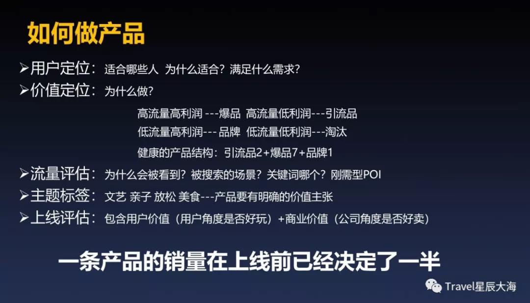 我一直覺(jué)得一條產(chǎn)品的銷(xiāo)量在上線之前,就已經(jīng)決定了一半,尤其是對(duì)于從用戶到生產(chǎn)的深度定制。在攜程,一條商家的產(chǎn)品丟過(guò)來(lái),3分鐘內(nèi)我基本能夠判斷這個(gè)ID30天的大概銷(xiāo)量。