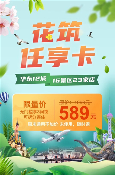 本次推出的預(yù)售套餐包含華東地區(qū)花筑民宿酒店“任享卡”,僅需589即可享受三晚入住,江浙滬皖共12城16個(gè)景區(qū)23家花筑門店全覆蓋,489元三晚超值入住麗江全境30家花筑民宿酒店,以及399元任選一晚價(jià)值千元的莫干山花筑美宿特惠活動(dòng)。三款套餐現(xiàn)已通過(guò)微信小程序、支付寶小程序,以及飛豬、馬蜂窩等多個(gè)平臺(tái)渠道開(kāi)始售賣。