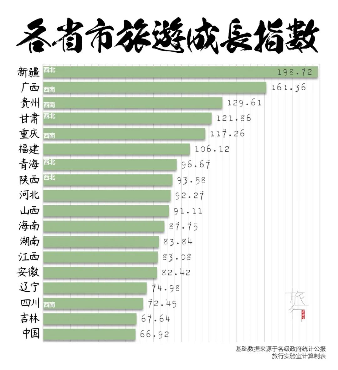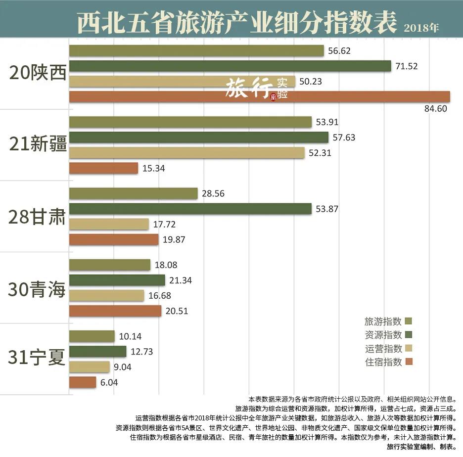 西北五省還缺寧夏,其體量過小不影響大局,甘肅、青海短時間內(nèi)也難以形成威脅。不過新疆198.72的成長指數(shù)是陜西93.58的兩倍有余,去年旅行實驗室還說新疆三五年內(nèi)難以撼動陜西西北旅游霸主的地位,看來有些托大了。