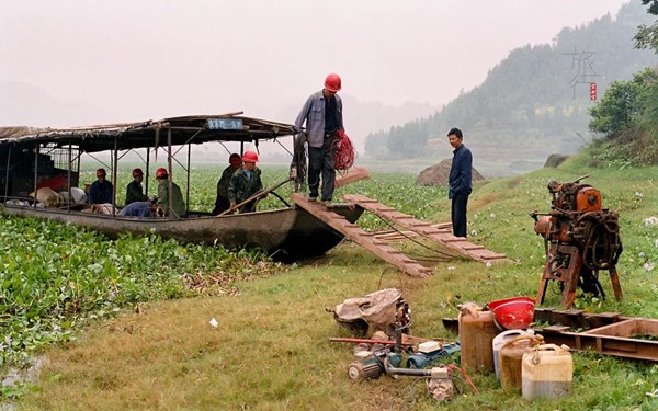 河道里密密麻麻的全是水葫蘆,渡船并不是直接過河,而是突突突地開出去很遠(yuǎn)。在船上我也鬧明白了,他們是臥佛溝的管理人員,今天包了渡船往里運(yùn)一個(gè)施工隊(duì)。