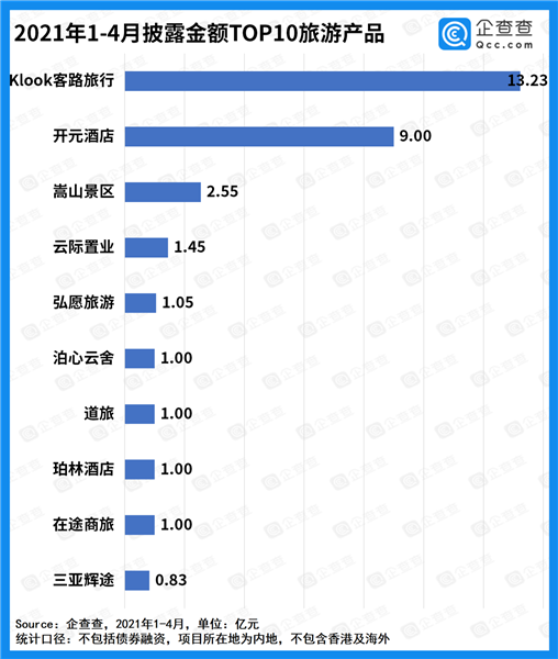 從旅游項(xiàng)目融資總金額來(lái)看,數(shù)據(jù)顯示,“Klook客路旅行”酒店以超13億元摘得魁首,“開(kāi)元酒店”9億元位居第二,“崇山景區(qū)”以2.55億元排名第三。