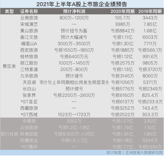 截至7月28日,A股上市旅游企業(yè)2021年上半年財(cái)報(bào)預(yù)告陸續(xù)披露。除宋城演藝、*ST圣亞、西藏旅游、*ST騰邦外,景區(qū)類(lèi)與旅行社類(lèi)的上市旅企今年上半年的盈虧情況,已頗為明朗。