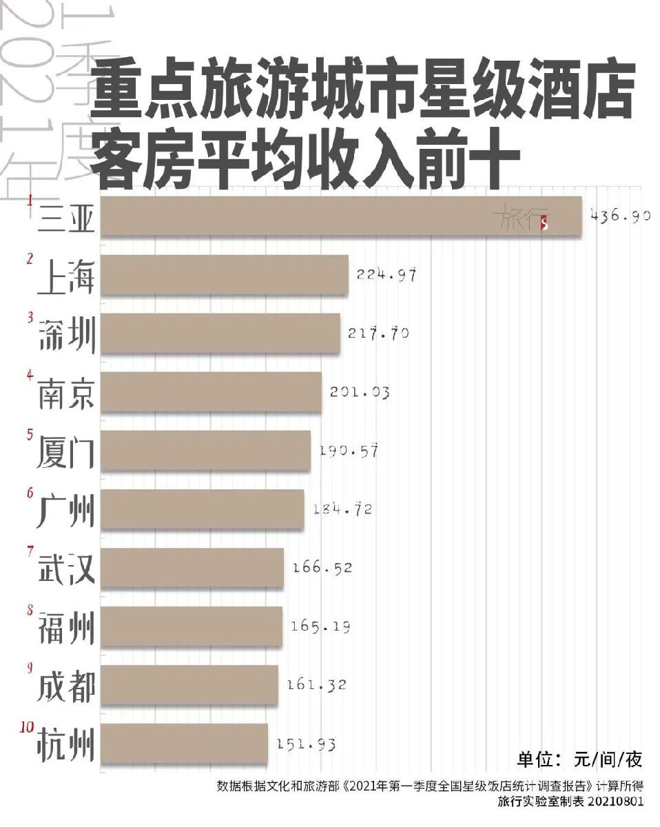 依據(jù)文化和旅游部公布的星級飯店經(jīng)營數(shù)據(jù),在2021年1季度旅游城市住宿收入的排名中我們可以發(fā)現(xiàn),除了三亞是真正的旅游城市之外,剩下的九座都是商貿(mào)重鎮(zhèn)。