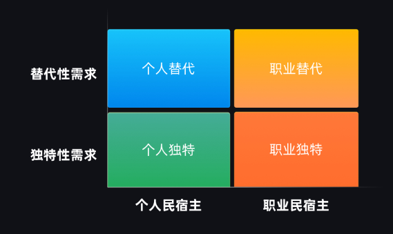 美國市場,個人民宿主占比非常高,獨(dú)特性需求占比也是明顯超過替代性需求。怎么理解?你去美國住民宿,很多確實(shí)是個人經(jīng)營,房東親自接待你,很多是house、別墅等裝修有特色、比較復(fù)古的產(chǎn)品。個人獨(dú)特的市場區(qū)間,這是歐美民宿市場的基本盤。國內(nèi)的情況呢,首先,國內(nèi)替代性需求過去占比是超過獨(dú)特性需求的占比,大概60%左右,個人民宿主的數(shù)量沒有職業(yè)民宿主的數(shù)量多,國內(nèi)最大市場是“個人替代、職業(yè)替代”這兩個,美國的“個人獨(dú)特”市場是最大的。