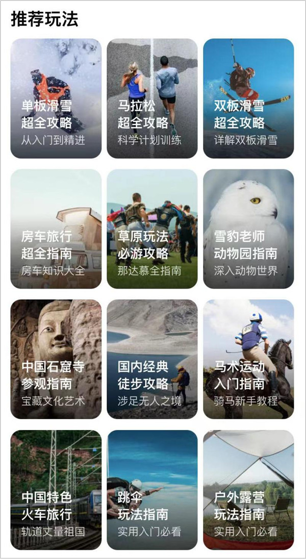 在“微度假”人群喜愛(ài)的熱門運(yùn)動(dòng)TOP 10榜單上,滑雪在北京冬奧的影響下占據(jù)榜首。而疫情之后人們對(duì)健康生活方式的重視,也使得徒步、爬山、馬拉松等既鍛煉身體又貼近自然的項(xiàng)目收獲了越來(lái)越多的關(guān)注。除了傳統(tǒng)運(yùn)動(dòng),還有更多年輕人把目光投向了深潛、沖浪、跳傘等新興體育項(xiàng)目,在玩法上也日趨多樣。在馬蜂窩北極星攻略上,這些玩法均有專屬的系統(tǒng)化攻略。