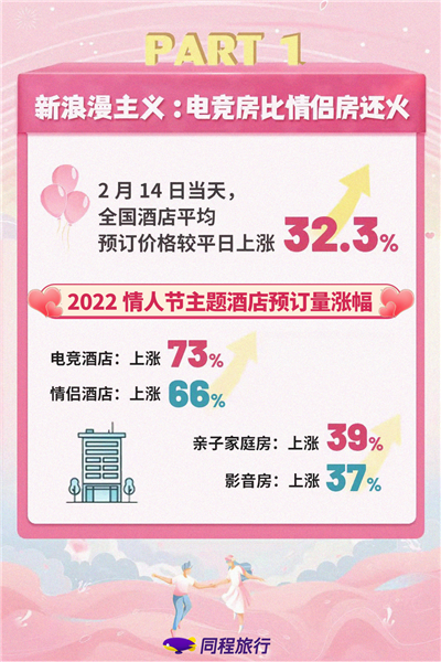 同程旅行大數(shù)據(jù)顯示,情人節(jié)當(dāng)天,情侶主題酒店訂單量較平日上漲66%,電競主題酒店訂單量漲幅則達(dá)到73%。情人節(jié)去電競酒店打游戲,成為專屬于年輕人的新型浪漫體驗。相比平日里多人房型滿房率較高的情況,情人節(jié)這一天不少熱門電競酒店的雙人房都早早訂滿,一房難求。