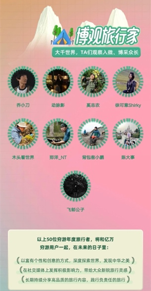今年的窮游網(wǎng)TOP50年度旅行者,從旅行內(nèi)容、影像、美食、生活方式等多維度篩選,最終評(píng)選出年度最具代表性的50位旅行人物。有締造萬(wàn)字好帖,用文字鋪就旅行舞臺(tái)的“筆尖圓舞者”,有用視頻、圖片將美景帶入旅行者心中的“光影捕手”,有探索世間美食的“食力玩家”,有把生活當(dāng)做旅行的“理想生活家”,還有博采眾長(zhǎng),對(duì)世間每一處生態(tài)、文化都保持著敬畏之心的“博觀旅行家”。