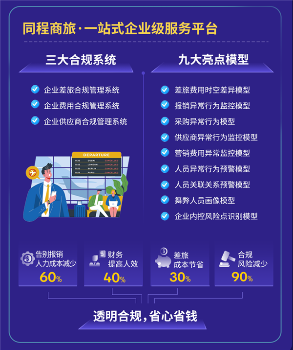 經(jīng)過測算,企業(yè)實(shí)施商旅管控后,包括交通、住宿等硬性成本和稅務(wù)等財(cái)務(wù)成本在內(nèi)的顯性成本節(jié)約超過10%,包括審批、貼票、報(bào)銷等環(huán)節(jié)的時(shí)間成本、人力成本、溝通成本等隱性成本的流程效率大幅提升65%以上,盡管增加了少量差旅服務(wù)采購成本,但總體差旅成本依然節(jié)省30%以上。