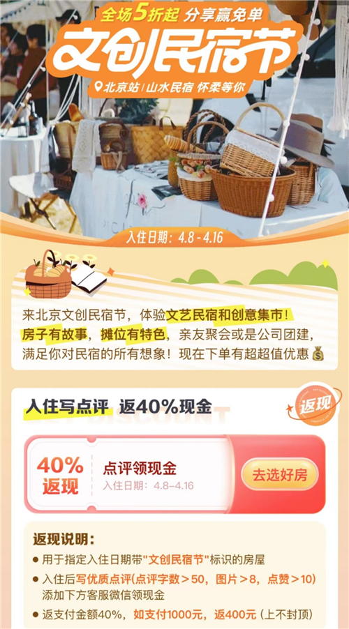 而對當(dāng)?shù)胤繓|而言,文創(chuàng)民宿節(jié)則可以為五一假期的民宿預(yù)訂蓄力。梧桐宿夏民宿房東范先生對記者表示,“看到平臺(tái)有活動(dòng),我就積極報(bào)名了。一方面是讓利給消費(fèi)者,讓更多人感受到京郊魅力。同時(shí)入住的客人寫優(yōu)質(zhì)點(diǎn)評,展示我們的高品質(zhì)民宿,能被更多人看到,也是為五一的旅游高峰預(yù)訂做準(zhǔn)備。”