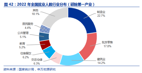 據(jù)申萬宏源分析師,在吸納就業(yè)的全國行業(yè)中,剔除第一產(chǎn)業(yè)后,2022年我國前五大行業(yè)占據(jù)就業(yè)人口的 67.2%:而其中批發(fā)零售業(yè)、交運倉儲以及住宿餐飲,都和旅游強相關(guān)。
