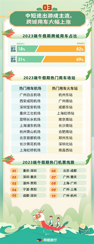 在用車方面,同程旅行數(shù)據(jù)顯示,2023年國內(nèi)跨城用車訂單占比由去年的18%提升到31%??绯怯密囆枨笾饕性陂L三角、珠三角、川渝、京津冀等城市群之間,上海、成都、長沙、南京、廣州是國內(nèi)用車需求最旺盛的城市,其中,上海和南京用車訂單同比增長超過390%。相比“五一”假期300公里以上用車需求占比偏高,端午假期的用車需求相對集中在80-160公里的短途出行,訂單占比為28%。