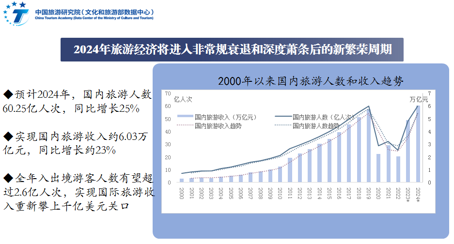 綜合研判,預(yù)計(jì)2024年全年國內(nèi)旅游人數(shù)將超過60億人次,國內(nèi)旅游收入有望突破6萬億元,入出境旅游人數(shù)合計(jì)將超過2.6億人次,實(shí)現(xiàn)國際旅游收入重新攀上千億美元關(guān)口。