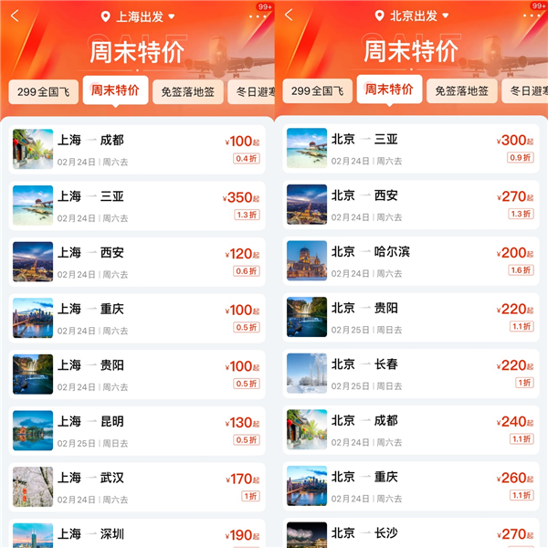 記者從攜程平臺(tái)查詢發(fā)現(xiàn),本周末有多趟特價(jià)機(jī)票可選。例如元宵當(dāng)天,從上海出發(fā)到成都、重慶、貴陽等地的多個(gè)航班票價(jià)不足百元,加上機(jī)建燃油費(fèi)后也僅有200元上下。北方游客還可以輕松到南方度過溫暖周末,從北京出發(fā)到三亞、???、昆明等南方城市的多個(gè)航班機(jī)票價(jià)格也不足300元。