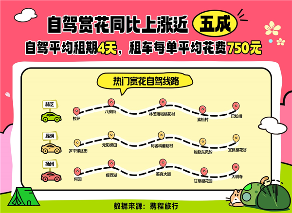 從當(dāng)前預(yù)訂情況來看,今年春季自駕熱門賞花目的地有:武漢、拉薩、無錫、揚(yáng)州、昆明、洛陽、黃山、南京、伊犁和喀什。熱門自駕路線有“拉薩—八廓街—林芝嘎拉桃花村—索松村—巴松錯(cuò)”“羅平螺絲田—元陽梯田—阿者科蘑菇村—彌勒東風(fēng)韻一宜良櫻花谷”“何園-瘦西湖-鑒真大道—甘泉櫻花園-大明寺”等。