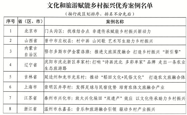 為全面貫徹黨的二十大精神,深入推進實施鄉(xiāng)村振興戰(zhàn)略,根據(jù)《文化和旅游部辦公廳關于征集文化和旅游賦能鄉(xiāng)村振興典型案例的通知》有關要求,文化和旅游部組織開展了文化和旅游賦能鄉(xiāng)村振興典型案例的征集和遴選工作,確定了文化和旅游賦能鄉(xiāng)村振興十佳案例和優(yōu)秀案例名單,現(xiàn)予公布。