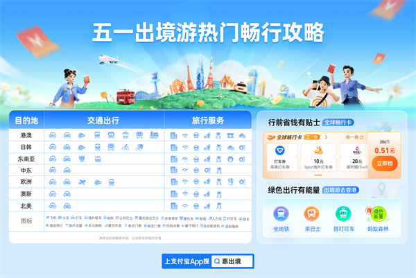 從4月22日起,支付寶提前聯(lián)合海外百萬(wàn)商戶,開始為中國(guó)出境游游客推出為期3周的「漫步全球 趣享世界」五一優(yōu)惠,覆蓋港澳、日韓、東南亞、歐洲、澳新、北美等國(guó)人出境游的大部分熱門目的地,其中首發(fā)的0.51元全球暢行卡服務(wù)品種多、綠色含量高?,F(xiàn)在,用戶上支付寶App搜「惠出境」,在出行前即可用0.51元買到價(jià)值超200元的全球暢行卡,內(nèi)含打折、免稅、機(jī)票、打車、流量等各類出境游的剛需權(quán)益集合,特別是鼓勵(lì)用戶通過(guò)公共交通方式,不僅可持續(xù)出游看世界,也可解鎖更多當(dāng)?shù)氐膶毑卮蚩c(diǎn)。