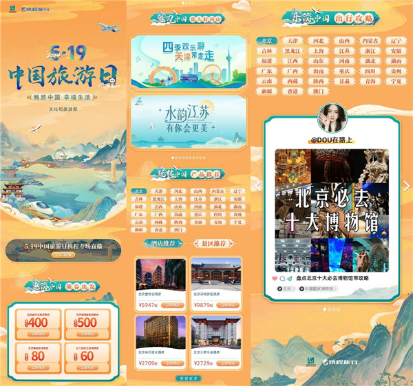 此外,攜程“暢游中國 幸福生活”中國旅游日專題活動頁面也于5月19日正式上線。專題頁開設(shè)了全國30多個省市、自治區(qū)、直轄市專屬頁面,聚合所在地熱門酒店、景區(qū)及旅游線路推薦,讓用戶可一站獲取目的地旅游攻略及優(yōu)惠產(chǎn)品。