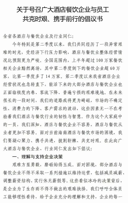 7月9日,一份由海南省酒店與餐飲行業(yè)協(xié)會(huì)、海南省烹飪協(xié)會(huì)和海南省酒店與餐飲行業(yè)工會(huì)聯(lián)合會(huì)聯(lián)名發(fā)布的倡議書在旅游業(yè)內(nèi)引發(fā)軒然大波。