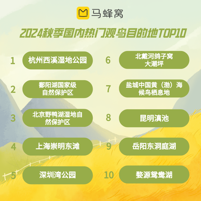 在年輕一代身體力行的探索下,越來(lái)越多過(guò)去小眾的玩法走入大眾視野,既能親近自然,又兼具知識(shí)性與趣味性,還能讓攝影愛(ài)好者們一展身手的“觀鳥(niǎo)”正吸引著越來(lái)越多的年輕人加入。候鳥(niǎo)遷徙的金秋時(shí)節(jié)正是許多地區(qū)的觀鳥(niǎo)黃金期,馬蜂窩大數(shù)據(jù)顯示,近一周“觀鳥(niǎo)”相關(guān)搜索熱度漲幅達(dá)105%。