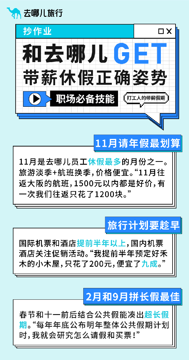 我們發(fā)現(xiàn)平臺(tái)上最會(huì)玩兒的人就藏在身邊——去哪兒?jiǎn)T工,他們認(rèn)為11月請(qǐng)年假最劃算;提前半年預(yù)訂出境游機(jī)票最便宜;2月和9月最適合拼假……一起看看這群最會(huì)玩兒的人是怎么休假的。