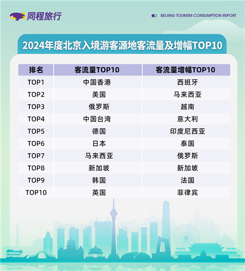 入境游的爆發(fā)式反彈是2024年度北京旅游消費(fèi)的一大亮點(diǎn) 。北京市文化和旅游局發(fā)布的數(shù)據(jù)顯示,2024年1月至10月,北京共接待入境游客317萬(wàn)人次,同比增長(zhǎng)198.8%?!秷?bào)告》來(lái)自同程旅行平臺(tái)的國(guó)際機(jī)票預(yù)訂數(shù)據(jù)顯示,北京位居2024年度中國(guó)入境游熱門目的地首位。北京入境游的前十大客源地依次為:中國(guó)香港、美國(guó)、俄羅斯、中國(guó)臺(tái)灣、德國(guó)、日本、馬來(lái)西亞、新加坡、韓國(guó)、英國(guó)。2024年度,伴隨著單方面免簽及過(guò)境免簽政策的持續(xù)優(yōu)化,北京入境游市場(chǎng)按下了“加速鍵”,其中,客流量增幅前十位的客源地依次為:西班牙、馬來(lái)西亞、越南、意大利、印度尼西亞、泰國(guó)、俄羅斯、新加坡、法國(guó)、菲律賓。在增幅較快的客源地中,西班牙、馬來(lái)西亞、意大利、印度尼西亞、泰國(guó)等均顯著受益于簽證政策的優(yōu)化。
