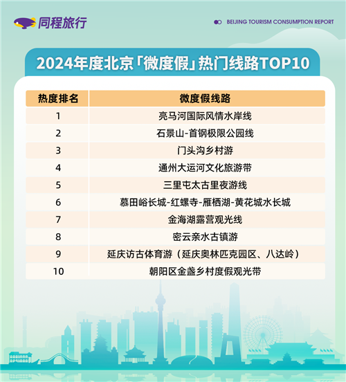 作為北京旅游度假市場(chǎng)的“新物種”,“微度假”在2024年呈現(xiàn)出供需兩旺的紅火景象?!秷?bào)告》來(lái)自同程旅行平臺(tái)的數(shù)據(jù)顯示,時(shí)尚文化、人文古跡、鄉(xiāng)村小院、體育+旅游是2024年北京市民及外地游客的“微度假”高人氣主題,比較熱門的線路主要有:亮馬河國(guó)際風(fēng)情水岸漫游線路、石景山-首鋼極限公園、門頭溝鄉(xiāng)村游、通州大運(yùn)河文化旅游帶、三里屯太古里夜游線、慕田峪長(zhǎng)城-紅螺寺-雁棲湖-黃花城水長(zhǎng)城、金海湖露營(yíng)觀光線、密云親水古鎮(zhèn)游、延慶訪古體育游(延慶奧林匹克園區(qū)、八達(dá)嶺長(zhǎng)城)、朝陽(yáng)金盞鄉(xiāng)村度假觀光帶等。