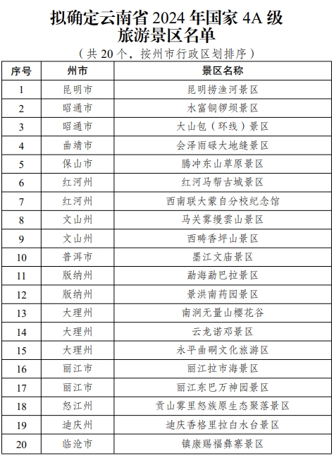 12月27日,云南省文化和旅游挺發(fā)布2024年國(guó)家4A級(jí)旅游景區(qū)擬確定名單。根據(jù)《旅游景區(qū)質(zhì)量等級(jí)的劃分與評(píng)定》(GB/T 17775-2003)國(guó)家標(biāo)準(zhǔn)和《旅游景區(qū)質(zhì)量等級(jí)管理辦法》要求,經(jīng)各州(市)文化和旅游局初評(píng)、推薦,省文化和旅游廳按程序認(rèn)真組織開(kāi)展了2024年國(guó)家4A級(jí)旅游景區(qū)評(píng)定工作,昆明撈魚(yú)河濕地公園等20家景區(qū)達(dá)到國(guó)家4A級(jí)旅游景區(qū)的標(biāo)準(zhǔn),擬確定為國(guó)家4A級(jí)旅游景區(qū)。名單如下: