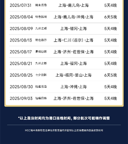 在航線方面,2025年新增仁川及釜山兩大熱門目的地航線,因郵輪免簽政策而頗受賓客歡迎;岸上游產(chǎn)品也帶來(lái)更多樣化的線路選擇,不僅帶來(lái)親子出游、歷史文化探索、名勝古跡參觀、溫泉體驗(yàn)等主題線路,也特別針對(duì)地中海游艇會(huì)賓客推出游艇會(huì)專享岸上游路線,賓客還可以在MSC地中海郵輪官網(wǎng)或小程序提前預(yù)約,享受優(yōu)惠的行前訂價(jià)格。