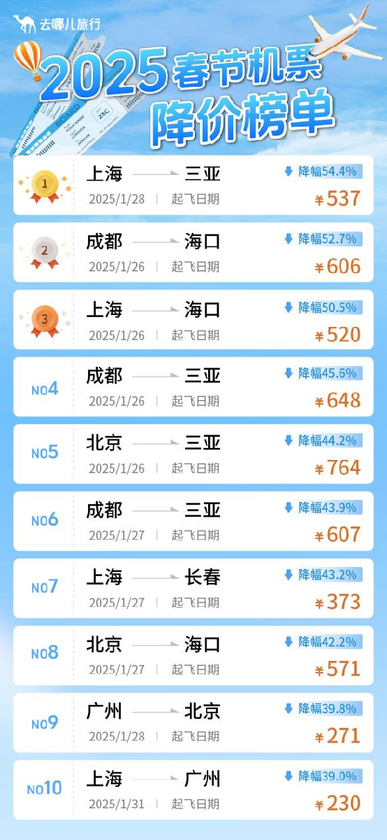 去哪兒盤點(diǎn)了近期國內(nèi)熱門機(jī)票降價(jià)榜,1月26日-29日各地前往??凇⑷齺喌臋C(jī)票價(jià)格降幅最高,如1月28日上海-三亞,同比近30天均價(jià)降價(jià)幅度近55%,降價(jià)金額超500元;1月26日成都-??诮祪r(jià)53%,最低606元起;北京-三亞,降價(jià)44%,最低764元起……