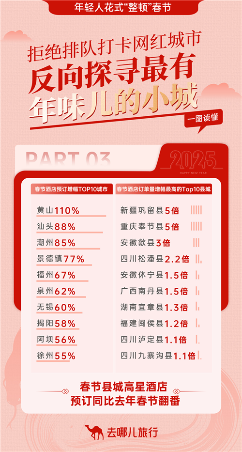但春節(jié)“吸金”能力飆升最快的還數(shù)縣城。去哪兒平臺(tái)預(yù)訂數(shù)據(jù)顯示,今年春節(jié)縣城高星酒店預(yù)訂同比去年春節(jié)翻番,預(yù)訂占比超過連鎖和低星酒店。春節(jié)酒店訂單量增幅最高的Top10縣城是:新疆鞏留縣、重慶奉節(jié)縣、安徽歙縣、四川松潘縣、安徽休寧縣、廣西南丹縣、湖南宜章縣、福建閩侯縣、四川瀘定縣、四川九寨溝縣。