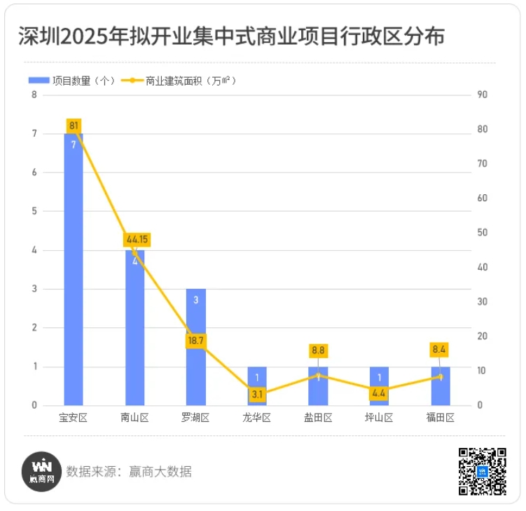 深圳,作為特區(qū)城市,年輕活力和無限包容的城市特性同樣折射在商業(yè)上。2024年新開業(yè)20個項目,躋身全國第三,2025年再保持近20家的擬開業(yè)量,寶安區(qū)是領頭羊,7個項目超80萬平方米商業(yè)體量,占了全市今年擬開業(yè)量近四成。