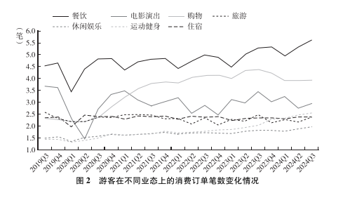 此外,美團(tuán)數(shù)據(jù)顯示,從需求看,從2019年第三季度至2024年第三季度,異地游客在餐飲、電影演出、購(gòu)物、旅游、休閑娛樂(lè)、運(yùn)動(dòng)健身、住宿等各類(lèi)消費(fèi)場(chǎng)景中的人均消費(fèi)訂單筆數(shù)在持續(xù)上升,平均訂單筆數(shù)從2019年第三季度的3.98筆提升至2024年第三季度的4.68筆,其中增長(zhǎng)最明顯的是購(gòu)物、運(yùn)動(dòng)健身和餐飲3個(gè)場(chǎng)景,統(tǒng)計(jì)周期內(nèi)的人均消費(fèi)訂單數(shù)量分別提升了1.6筆、1.1筆、1.1筆(見(jiàn)圖2)。若從供給側(cè)看,從2019年第三季度至2024年第三季度,全國(guó)范圍內(nèi)有過(guò)異地游客消費(fèi)記錄的商戶(hù)數(shù)量總體呈現(xiàn)逐年遞增趨勢(shì);分業(yè)態(tài)場(chǎng)景,作為傳統(tǒng)核心場(chǎng)景的旅游景區(qū)及住宿業(yè)態(tài)分別增長(zhǎng)204.9%和188.9%,而休閑娛樂(lè)、運(yùn)動(dòng)健身兩類(lèi)業(yè)態(tài)的商戶(hù)數(shù)量的增幅則達(dá)到538.6%和826.6%。