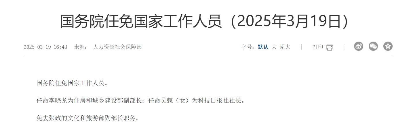 3月19日,國(guó)務(wù)院發(fā)布任免國(guó)家工作人員公告。任命李曉龍為住房和城鄉(xiāng)建設(shè)部副部長(zhǎng);任命吳兢(女)為科技日?qǐng)?bào)社社長(zhǎng)。免去張政的文化和旅游部副部長(zhǎng)職務(wù),據(jù)媒體此前報(bào)道,今年3月,張政已任中國(guó)文聯(lián)黨組書(shū)記。