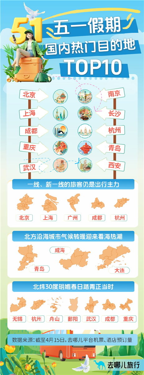 在去哪兒平臺(tái)上,北京、上海、廣州、成都、杭州等一線、新一線城市的旅客仍是出行主力。從目的地來看,北方沿海城市如青島、威海、大連等因氣候轉(zhuǎn)暖迎來看海熱潮;北緯30度迎來明媚春日,江蘇無錫,浙江杭州、舟山、紹興,江西鄱陽湖,湖北武漢、恩施,四川成都,重慶等,都將迎來賞春踏青的旅客。