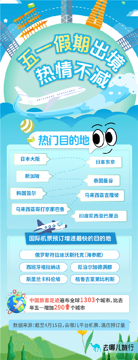 去哪兒平臺(tái)數(shù)據(jù)顯示,五一假期出境游預(yù)訂也已進(jìn)入高峰。中國(guó)旅客的目的地遍布全球1303個(gè)城市,比去年五一增加了日本門真、米子市,德國(guó)德累斯頓,英國(guó)布萊克浦等290個(gè)城市,預(yù)訂增幅超過兩成。