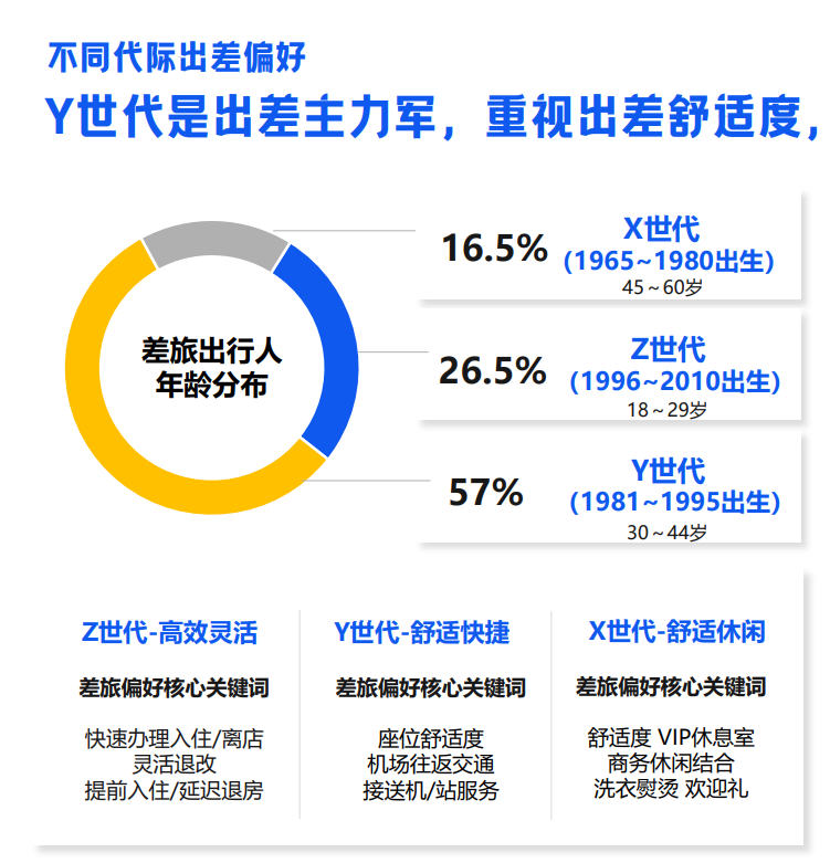不同世代方面:X世代(1965~1980出生)偏好舒適及商務(wù)休閑相結(jié)合,偏愛飛機(jī)出行;Y世代(1981~1995出生)是出差主力軍占比57%,更在意舒適與快捷;Z世代(1996~2010出生)偏愛火車/高鐵出行,則更注重高效與靈活。
