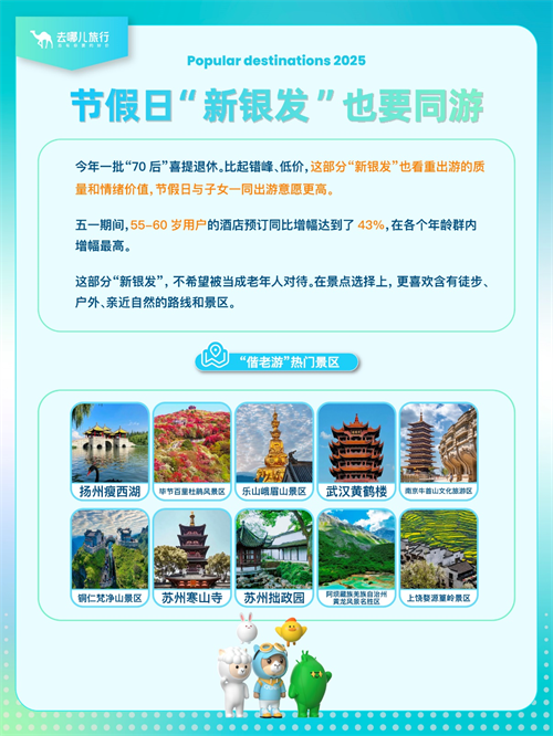 從去哪兒門(mén)票和度假預(yù)訂情況來(lái)看,這部分“新銀發(fā)”更喜歡自由行。在景點(diǎn)選擇上,“不希望被當(dāng)成老年人對(duì)待”。只是與部分年輕人喜歡“躺平”游不同,在景點(diǎn)選擇上,他們更喜歡含有徒步、戶外、親近自然的路線和景區(qū)。