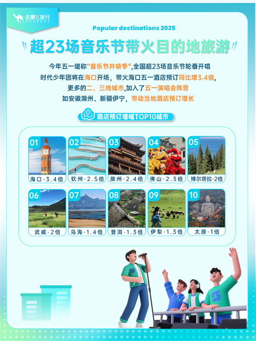 反向游、文化+旅游,景區(qū)門(mén)票預(yù)訂同比增超四成。全國(guó)超23場(chǎng)音樂(lè)節(jié),帶動(dòng)熱門(mén)城市酒店預(yù)訂增幅超3倍。