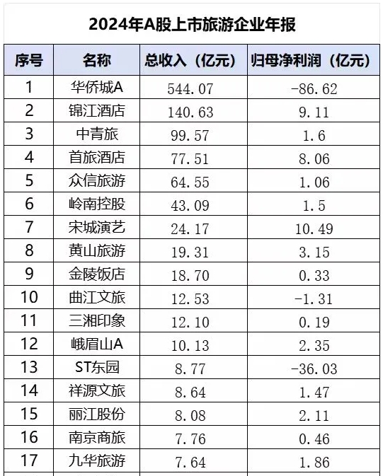 2024年報(bào)數(shù)據(jù)進(jìn)一步印證了其良好勢(shì)頭。在A股34家上市旅游企業(yè)中,總收入前三名為華僑城A、錦江酒店、中青旅;歸母凈利潤前三名為宋城演藝、錦江酒店、首旅酒店。