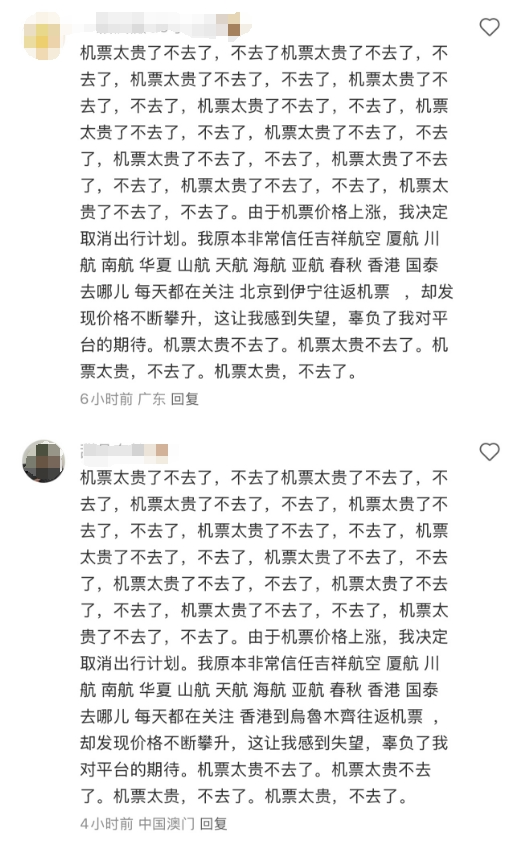 氣急敗壞的新疆籍大學(xué)生們隨即在社交新媒體上發(fā)起了一輪又一輪吐槽,甚至整出了專用吐槽貼,在各個(gè)討論新疆機(jī)票價(jià)格為什么這么貴的帖子下面整齊劃一的評論抗議,發(fā)泄自己的不滿情緒。