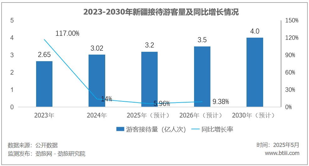 新疆官方期待今年能夠吸引3.2億人次游客,鑒于前五個(gè)月已經(jīng)完成近26%份額,全年大幅超過預(yù)定目標(biāo)幾乎板上釘釘。另外根據(jù)《新疆維吾爾自治區(qū)文化和旅游產(chǎn)業(yè)集群發(fā)展規(guī)劃(2025—2030年)》,預(yù)計(jì)2030年新疆旅游人次將突破4億。而按照現(xiàn)有增速和發(fā)展趨勢,新疆大概率能夠提前完成這一目標(biāo)。