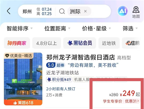 大四學生小范準備去鄭州畢業(yè)旅行。他打開美團App查詢發(fā)現(xiàn),鄭州龍子湖智選假日酒店7月下旬的“學生價”僅需200多元一晚。“從北京坐高鐵去鄭州非常便捷,訂高星酒店又可享受學生價,這趟畢業(yè)旅行想想就開心”,小范對旅途充滿期待。