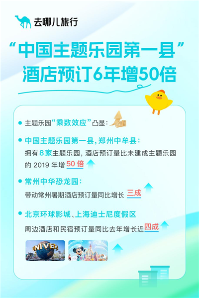 如鄭州中牟縣被稱為“中國主題樂園第一縣”,擁有包括鄭州方特歡樂世界、只有河南·戲劇幻城、鄭州海昌海洋樂園等8家主題樂園。去哪兒數(shù)據(jù)顯示,今年暑期,平臺中牟縣酒店預訂量比未建成主題樂園的2019年同期,增長50倍。