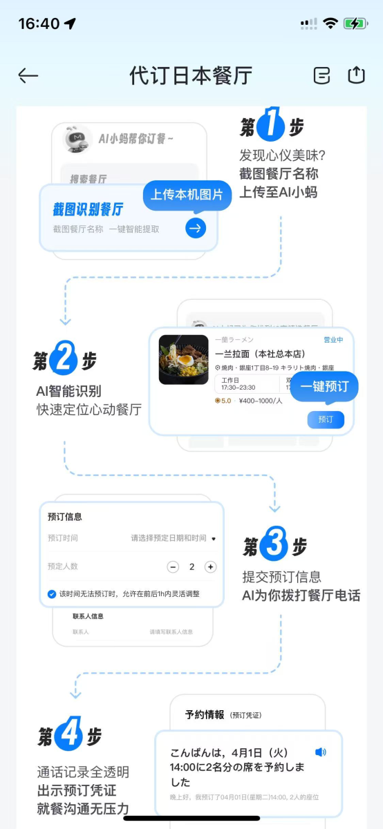 在不斷深化個(gè)性化服務(wù)的同時(shí),馬蜂窩AI旅行助手“AI小螞“同樣新增三大關(guān)注旅行中細(xì)節(jié)需求的實(shí)用功能。日本餐廳很多需要預(yù)約,而語(yǔ)言障礙卻曾讓不少游客“頭疼不已”,有了“AI代訂日本餐廳”,用戶(hù)只需截圖心儀餐廳界面,AI將自動(dòng)識(shí)別并提取餐廳名稱(chēng)、地址、營(yíng)業(yè)時(shí)間及人均消費(fèi),在選定日期、人數(shù)及時(shí)段后,AI可直接撥打餐廳電話(huà)完成預(yù)訂,全程無(wú)需用戶(hù)參與溝通,預(yù)訂成功的日文憑證實(shí)時(shí)同步至手機(jī)。