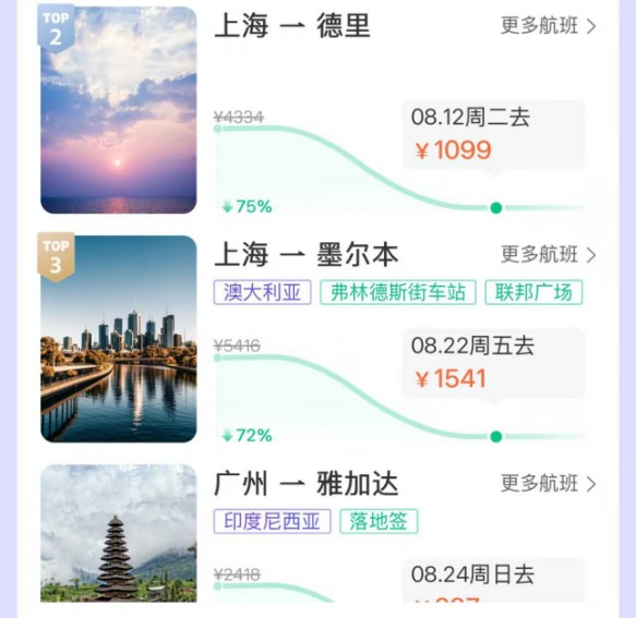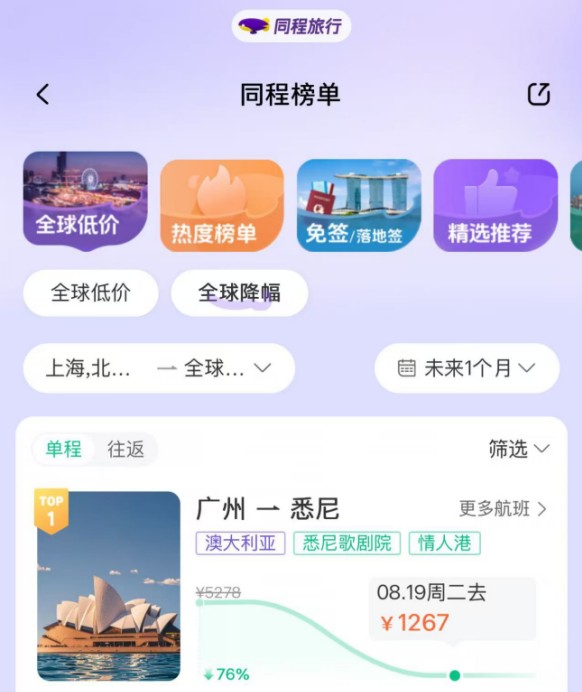 在同程旅行APP機(jī)票頻道的“全球低價(jià)”榜單上,7月25日以后的未來一個(gè)月內(nèi),廣州-悉尼、上海-墨爾本、廣州-墨爾本、上海-布里斯班的部分航班機(jī)票含稅價(jià)格降幅顯著。盡管部分特價(jià)航班的中轉(zhuǎn)時(shí)間超過10個(gè)小時(shí),但是由于中轉(zhuǎn)城市為免簽國(guó)家,游客可以用1張直飛(折扣)機(jī)票的價(jià)格,游玩2個(gè)國(guó)家。