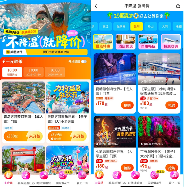 其中,昆明、大理、西雙版納等云南多個(gè)目的地入選美團(tuán)旅行“全國清涼游會場”清涼城市,用戶可以在美團(tuán)線上會場,看到門票、酒店、度假游玩到交通出行的全方位優(yōu)惠供給,一站式下單高性價(jià)比清涼體驗(yàn)。