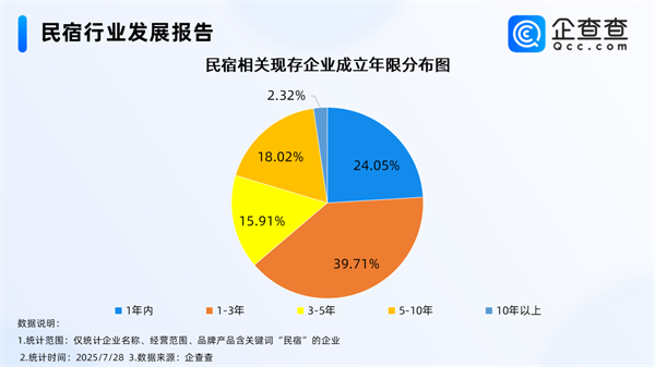 企查查數(shù)據(jù)顯示,截至7月下旬,國(guó)內(nèi)民宿相關(guān)現(xiàn)存企業(yè)達(dá)35.71萬(wàn)家,從成立年限來(lái)看,超6成相關(guān)企業(yè)成立于近3年。其中,成立年限在1-3年的相關(guān)企業(yè),占比39.71%,成立年限在1年內(nèi)的相關(guān)企業(yè)占比達(dá)24.05%。此外,成立年限在10年以上的企業(yè),占比達(dá)2.32%。
