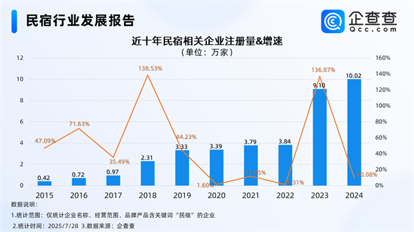企查查數(shù)據(jù)顯示,截至7月下旬,國(guó)內(nèi)民宿相關(guān)現(xiàn)存企業(yè)達(dá)35.71萬(wàn)家,從成立年限來(lái)看,超6成相關(guān)企業(yè)成立于近3年。從注冊(cè)量角度來(lái)看,2023年起,國(guó)內(nèi)民宿相關(guān)企業(yè)注冊(cè)量快速增長(zhǎng),2023年注冊(cè)量達(dá)9.1萬(wàn)家,同比增長(zhǎng)136.87%,2024年注冊(cè)量達(dá)10.02萬(wàn)家,截至目前今年已注冊(cè)5.04萬(wàn)家,今年新注冊(cè)的民宿相關(guān)企業(yè)多分布在西南地區(qū)、華東地區(qū)。