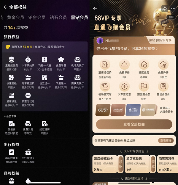 該會(huì)員體系最高級(jí)別為“黑鉆”。升級(jí)到這一級(jí)別的會(huì)員可獲得由飛豬提供的不限次免費(fèi)升房、不限次延遲退房、酒店專享價(jià)等旅行權(quán)益,同時(shí)還能直通飛豬F5級(jí)會(huì)員,體驗(yàn)到飛豬會(huì)員最具辨識(shí)度的大牌會(huì)員互通權(quán)益。